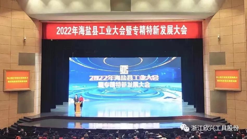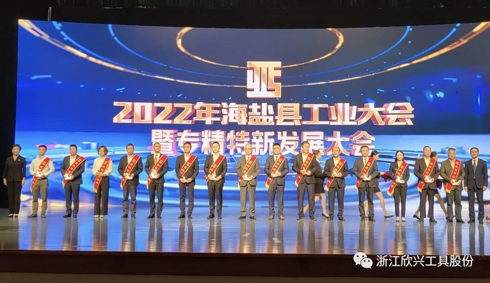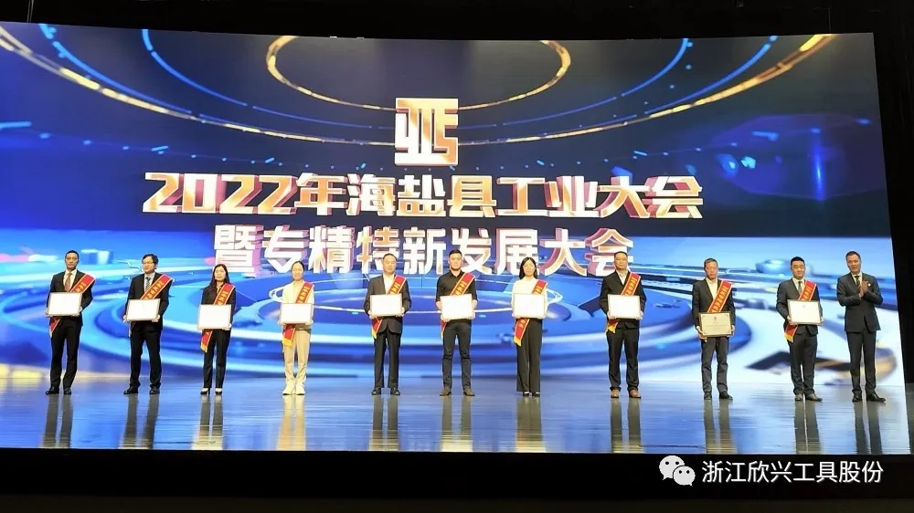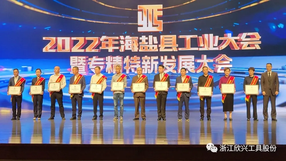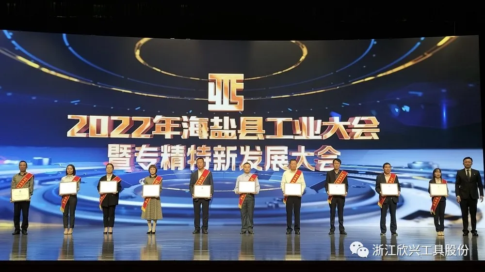 大會表彰了2021年度海鹽工業涌現出的一批優秀企業和優秀企業家,欣興工具董事長榮獲”海鹽縣優秀企業家“,公司榮獲”專精特新發展示范企業“”畝均效益領跑企業“”科技創新示范企業“。