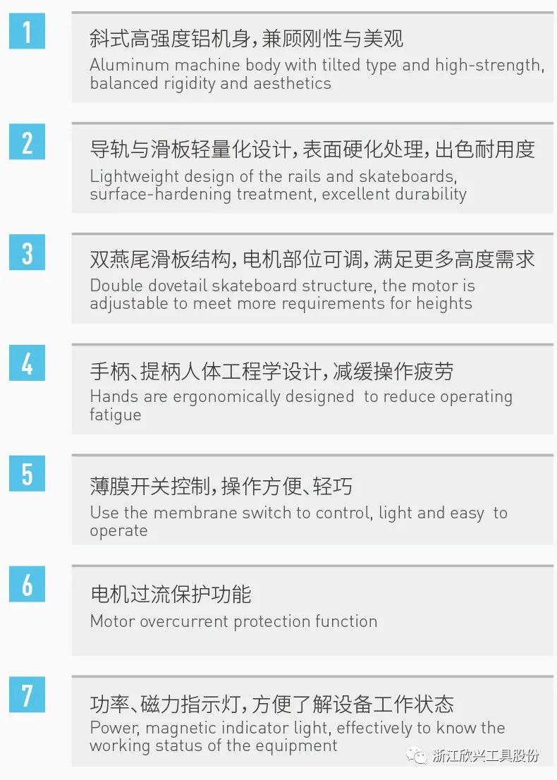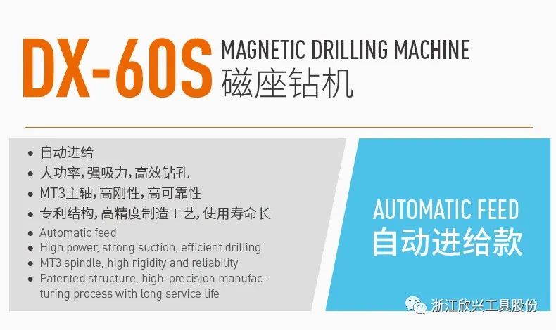 十年磨一劍,2023年欣興工具強勢推出新一代S系列自動進給磁座鉆機DX-60S。這款磁座鉆機解決了人工進給速度不穩定的大難題。進給速度的不穩定性,會導致刀具磨損加速,縮短刀具使用壽命,并且人工進給對操作人員有較高的技術要求。自動進給鉆機擁有穩定的進給速度,很好地保護了刀具,延長刀具使用壽命,同時減少工人工作強度,讓鉆孔變得更輕松。自動進給功能還避免了人工進給操作不當所引發的問題,降低新手操作難度。在符合加工條件的基礎上可以實現一人兩機操作,提高鉆孔效率。DX-60S將為您帶來簡單、便捷、高效的鉆孔體驗!欣興工具一直秉持著持久創新的理念,不斷前進!