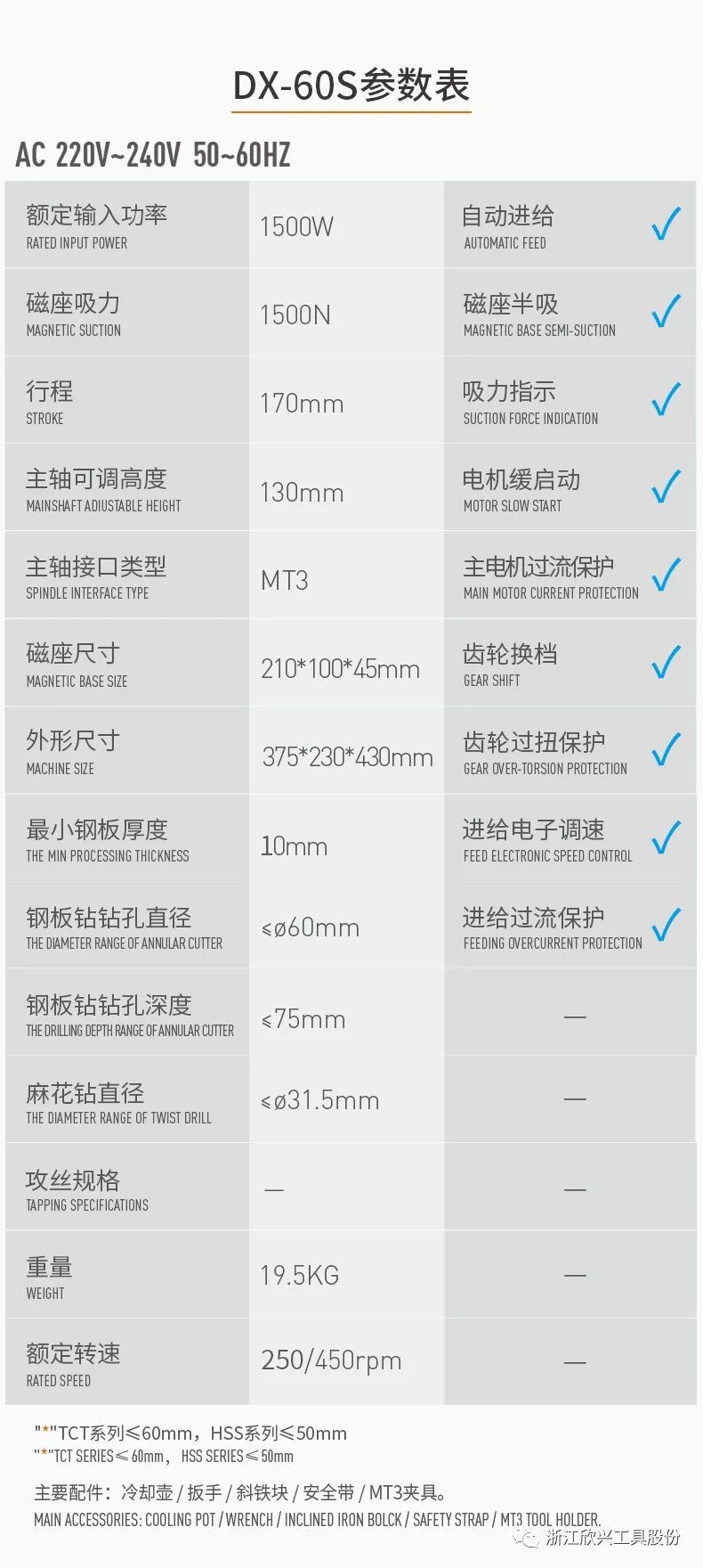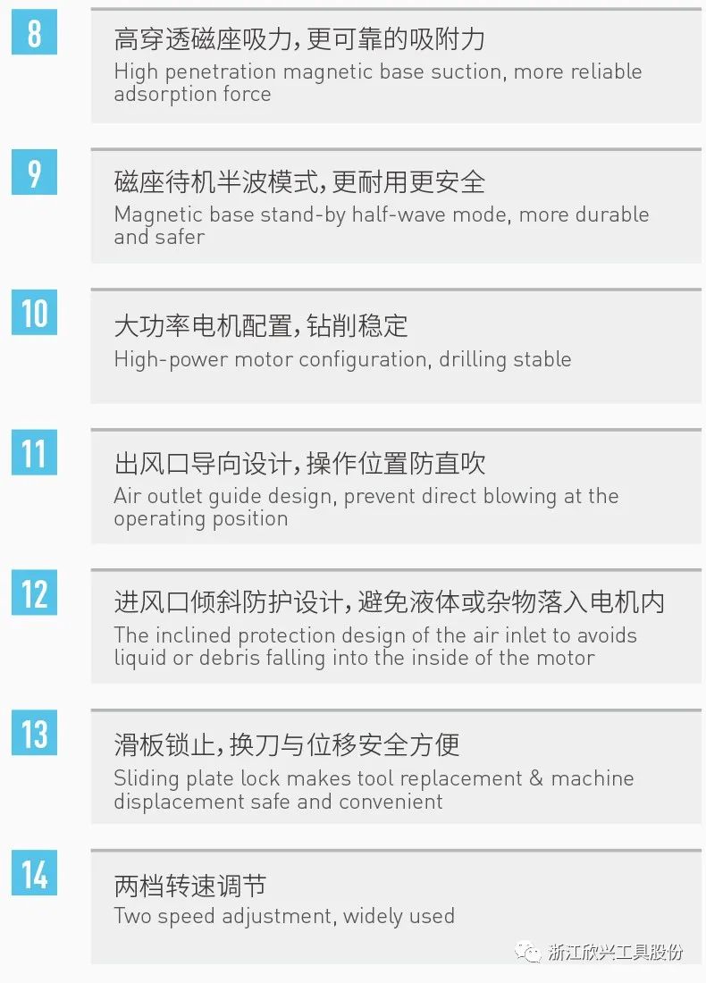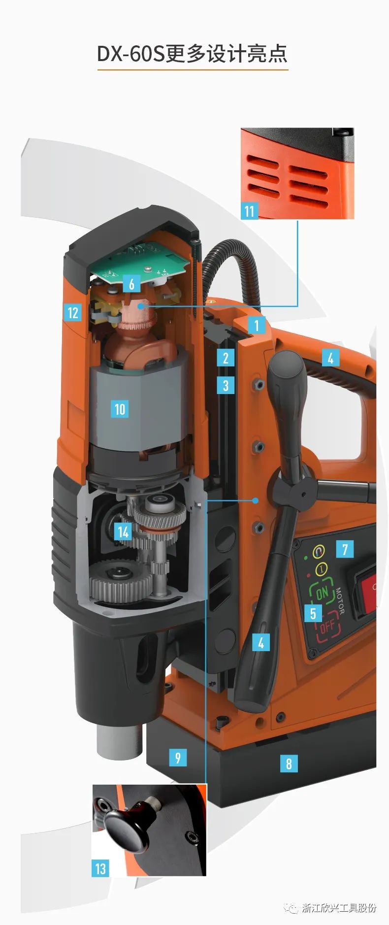 2012年欣興工具推出高性能標準款磁座鉆機DX-35,其品質受到了國內外客戶的眾多好評。隨后,欣興工具陸續推出了DX-60、DX-120,滿足了從直徑10mm~120mm鋼板鉆(空心鉆頭)的鉆孔需求。2020年欣興工具重磅推出X系列的鉆攻一體磁座鉆機DX-60X和DX-120X,鉆孔攻絲一機完成。設備擁有磁座吸力指示、電機過流報警、電機緩啟等眾多亮點,齒輪精度均達到汽車用齒級別。
