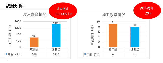 通過創恒雙頂角鏟鉆的實際應用,客戶切實感受到了明顯的效益提升。在現場加工過程中,刀具壽命同比提升了137.5%,這意味著在相同的生產周期內,刀具的更換次數大幅減少。有效延緩刀具的消耗,不僅降低了采購成本,還減少了因更換刀具導致的生產線停機時間,從而大幅提高了生產效率。